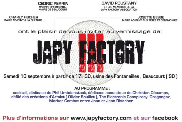 Lors du vernissage de la troisième édition de la Japy Factory, vous pourrez voir ma dernière collection sur un mix de Dragongaz... le défilé a lieu le samedi 10 septembre 2011 dans une usine construite en 1883, aujourd'hui désaffectée, transformée par l'association "Japy Factory" en temple éphémère de la contre culture. La Japy Factory III, c'est deux semaines d'expositions, concerts et performances... le tout gratuit!!!