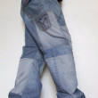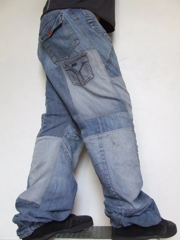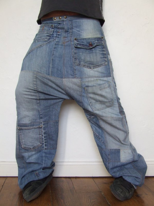 Baggy-sarouel en jeans bleu clair, matière récupérée sur jeans usés.