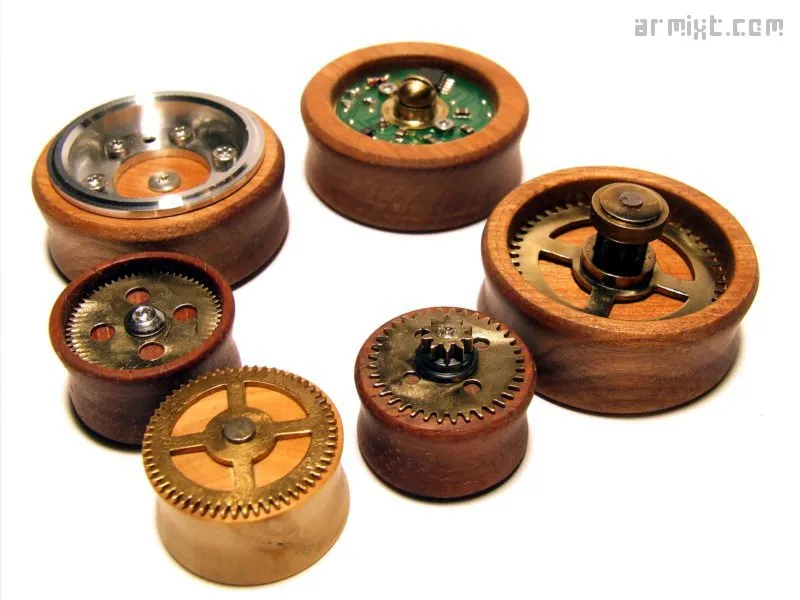 Je tourne moi-même différents bois dans plusieurs tailles, réalise les motifs, y incruste mécanismes, engrenages en métal... entièrement réalisé à la main, chaque plug devient alors une pièce unique. Chaque pièce est enduite de cire d'abeille, ce qui rend le bois doux et brillant.
