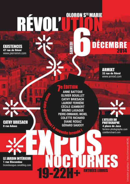 Le concept : une exposition artistique et itinérante en nocturne (de 19h à 22h+) dans et autour de la rue de Révol, jusqu'à Ste Croix, à Oloron-Sainte-Marie, Aquitaine. Toutes les infos sont sur l'affiche... ;)