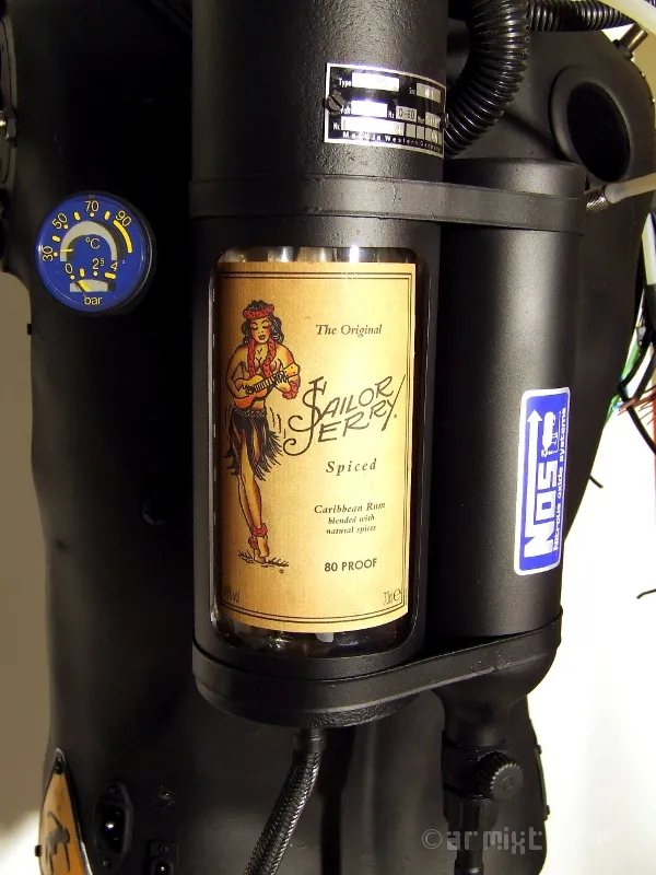 En remerciement de notre collab', j'y ai mis une bouteille de Sailor Jerry, qui peut être éclairée. Grâce à une pompe, ce mannequin devient en plus, par simple pression sur un petit bouton rouge, un ... distributeur de rhum !
