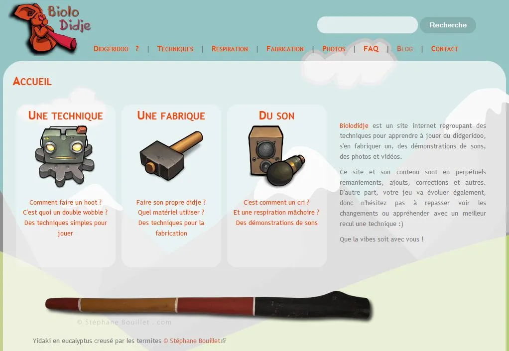 Voici un site très bien fait sur le didgeridoo, "Biolodidje" vous donne une présentation générale du didgeridoo, des techniques pour en jouer, mais aussi des astuces pour s'en fabriquer un... vous y trouverez des photos, des démos et pleins d'autres trucs...