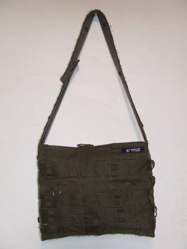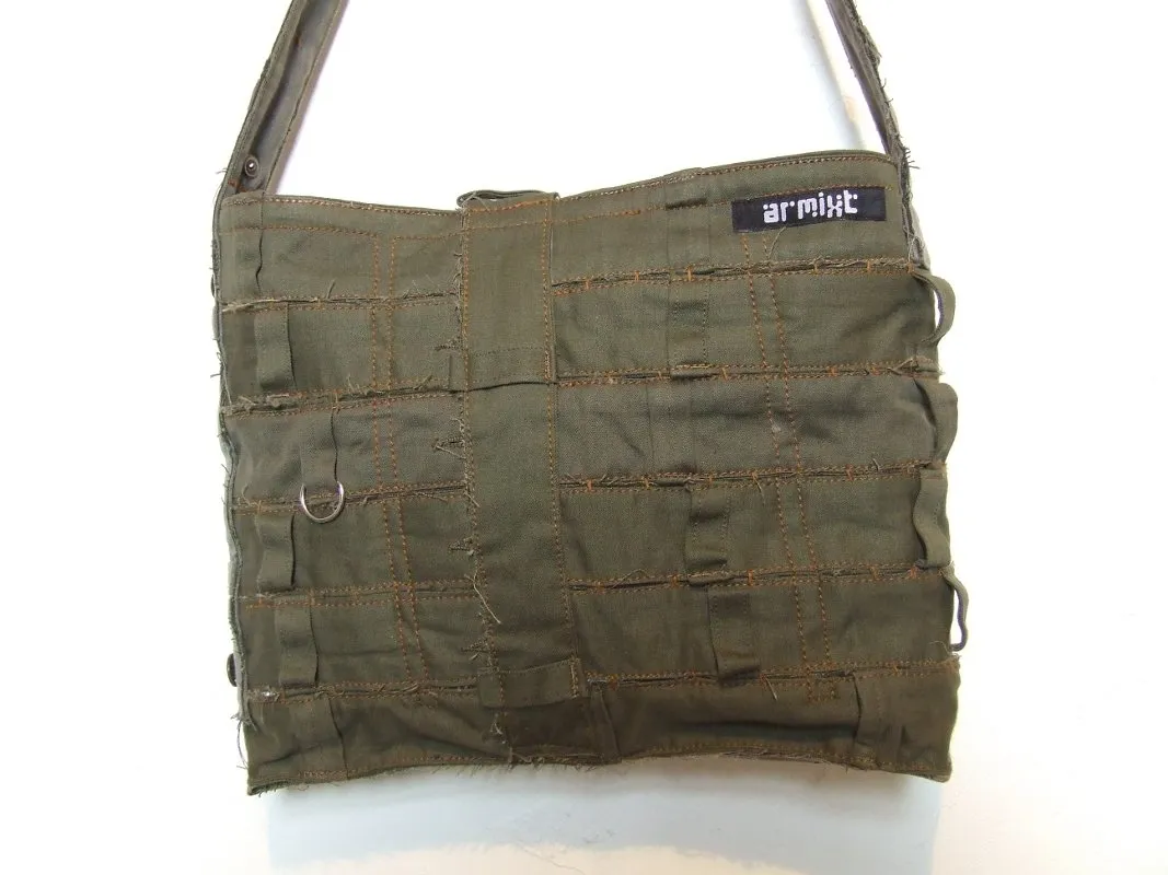 Sac de couleur kaki pour femme, à base de ceintures de treillis militaires, doublure camouflage, une poche intérieure, bandoulière réglable, fermeture du sac par bouton.