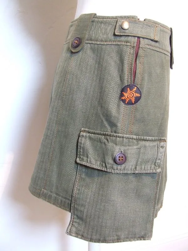 Jupe en coton kaki, matière récupérée sur une chemise épaisse militaire.