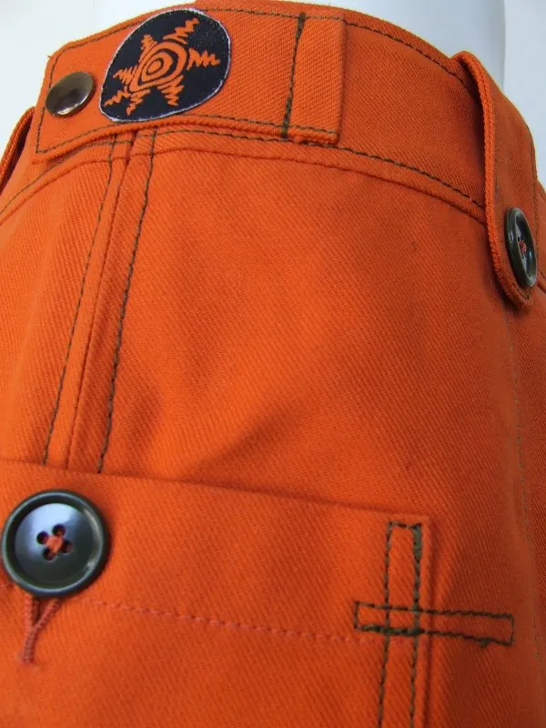 Jupe orange, matière récupérée sur un pantalon de travail.