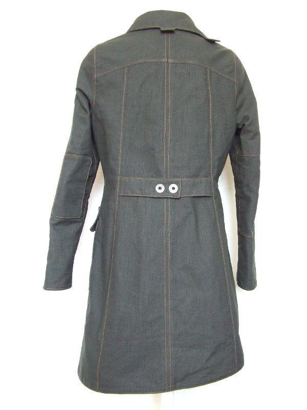 Manteau de coupe asymétrique et ajusté à la taille. Toile épaisse kaki-foncé et surpiqûres orange. Entièrement doublé Fermeture boutonnée 3 poches t. 42 (EPUISE) Disponibilité : venduPublié dans : ModeVoir plus de : FemmeCotonManteau