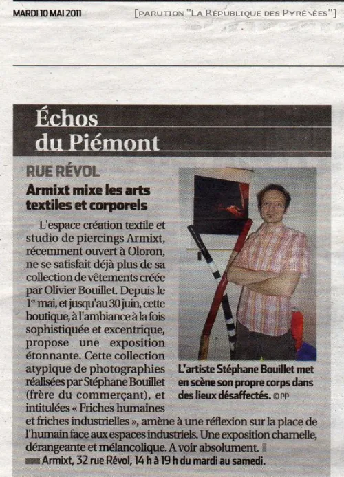 Le photographe Stéphane Bouillet expose à la boutique Armixt, une partie de son projet personnel intitulé "Wast(m)e"... du 1er mai au 30 juin 2011. Suite au vernissage du vendredi 6 mai 2011, nous découvrons avec le sourire un article fort sympathique dans la rubrique "Echos du piémont" du journal "La République des Pyrénées"... Bonne lecture...