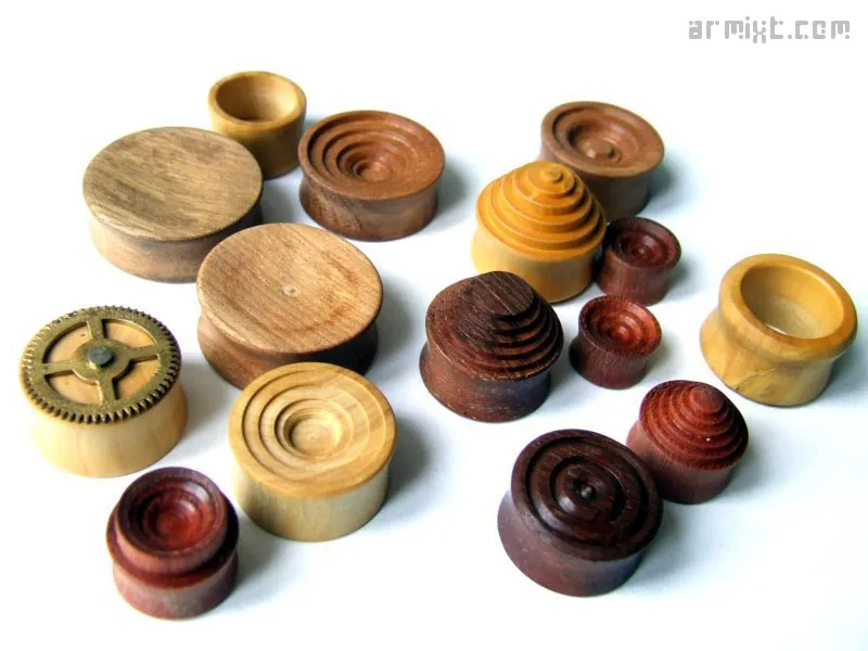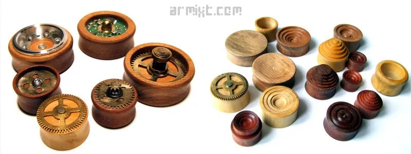 Je tourne moi-même différents bois dans plusieurs tailles, réalise les motifs, y incruste mécanismes, engrenages en métal... entièrement réalisé à la main, chaque plug devient alors une pièce unique. Chaque pièce est enduite de cire d'abeille, ce qui rend le bois doux et brillant.