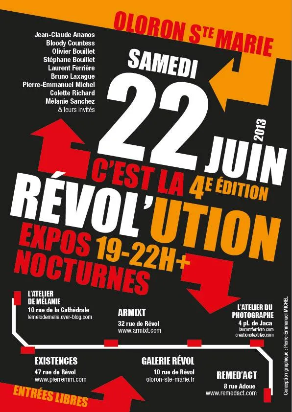 La 4e Révol'ution est un événement artistique rassemblant les ateliers/galeries situés dans et aux alentours de la rue de Révol à Oloron-Sainte-Marie (Pyrénées Atlantiques). Samedi 22 juin, à partir de 19h, les artistes de la rue Révol refont la Révol'ution ! Cette nouvelle édition de la nocturne artistique prend du volume avec deux nouveaux espaces et des invités. Entrées libres